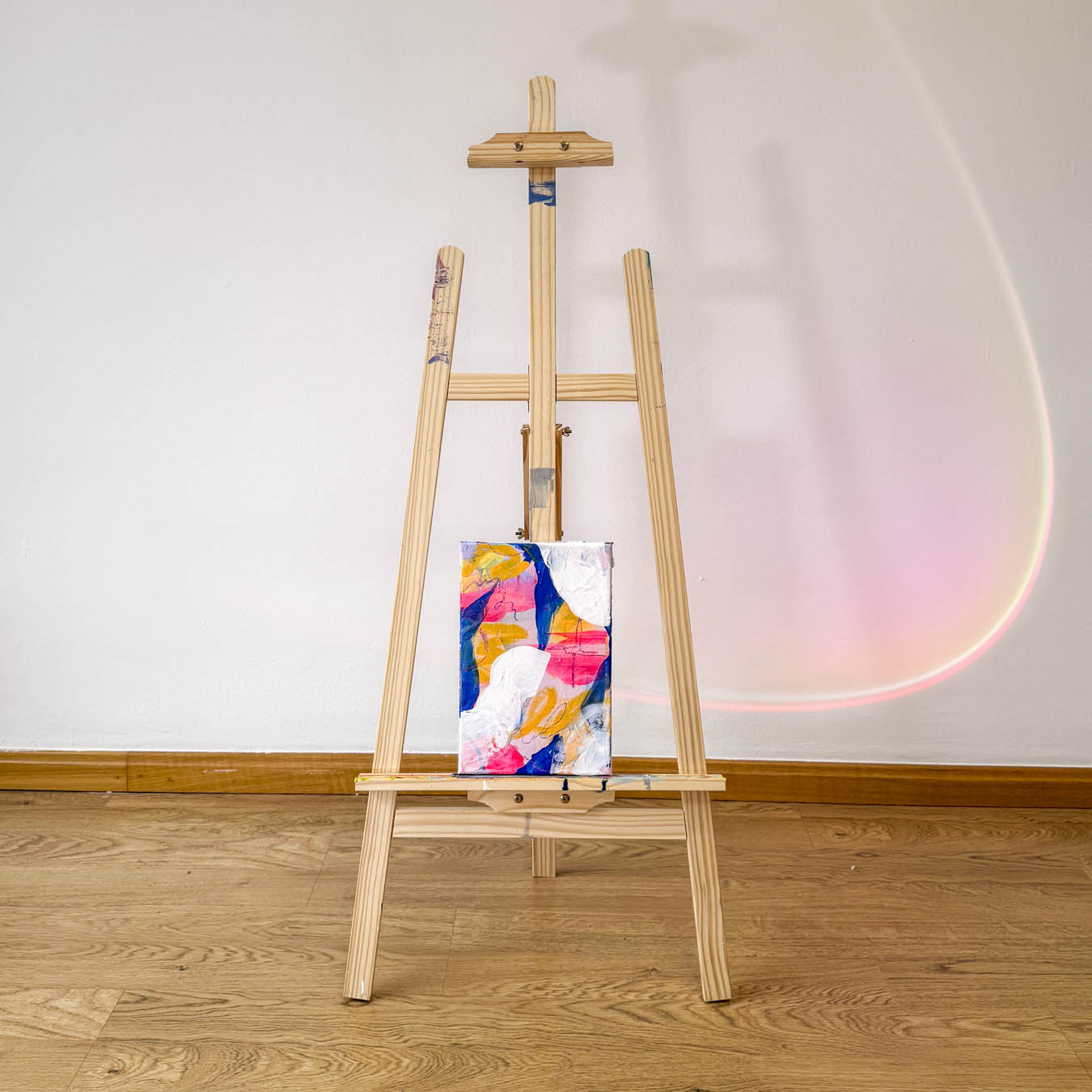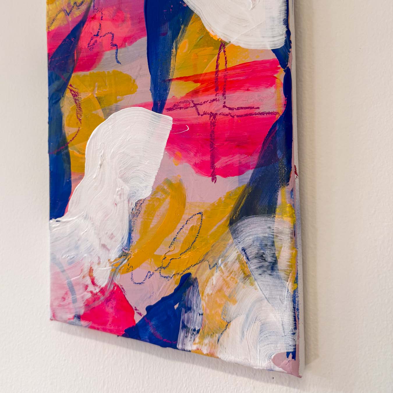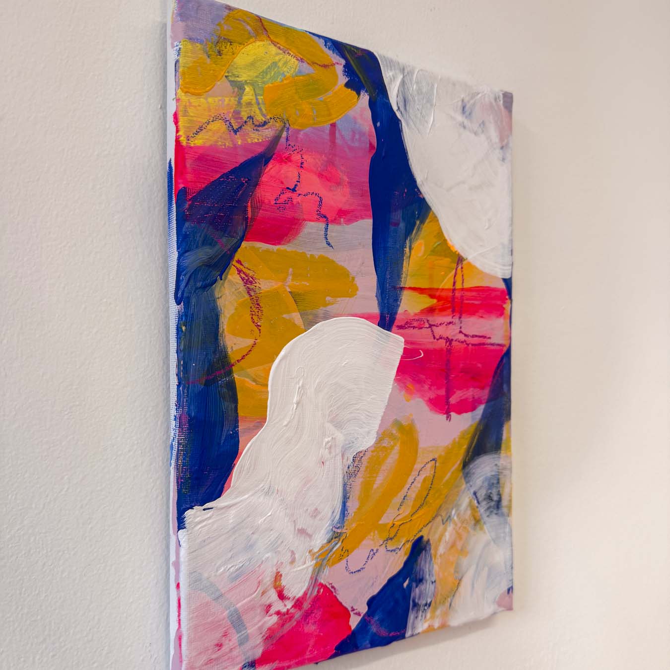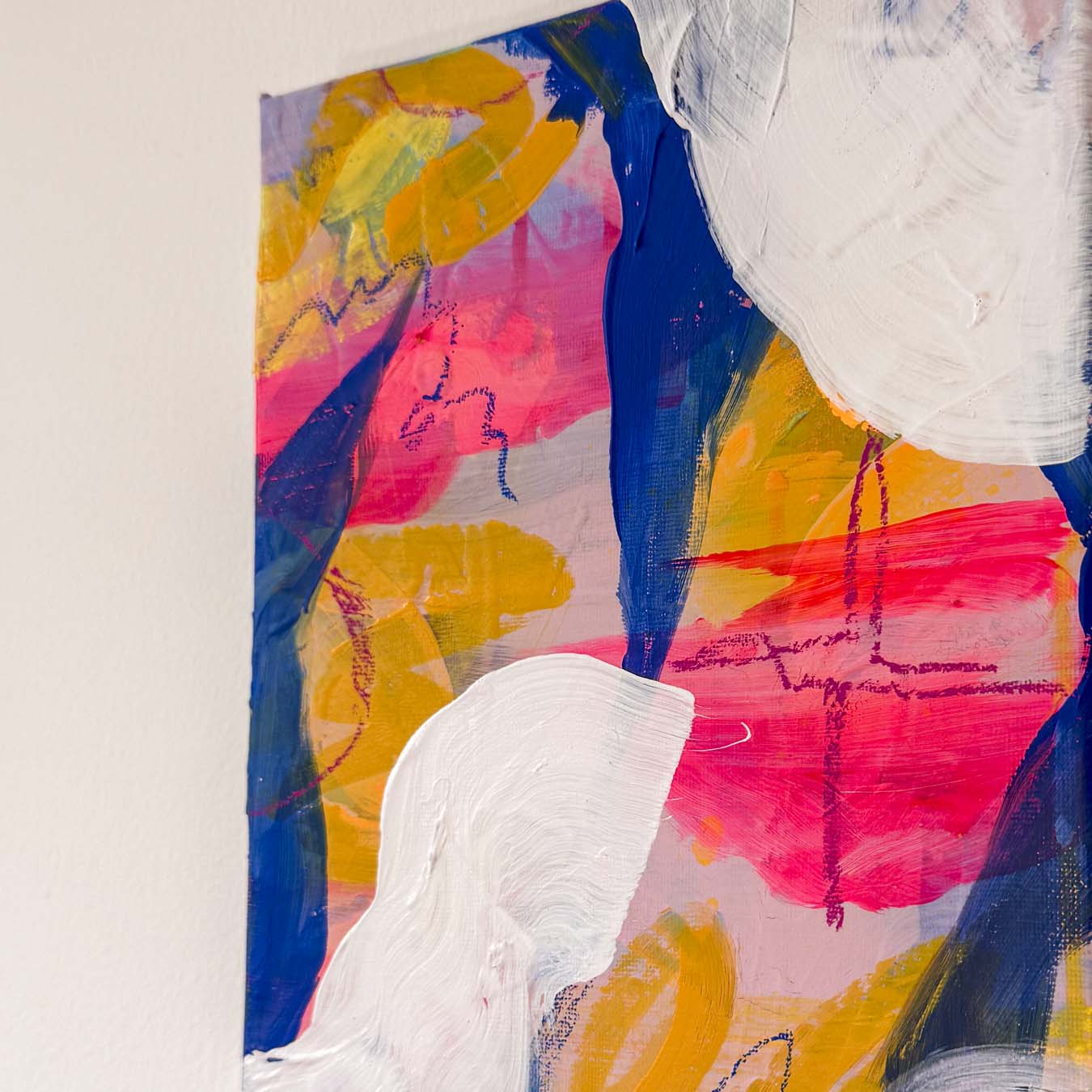 En esta pieza el color se organiza en planos que chocan y se sostienen mutuamente. Rosa neón, azul profundo y amarillo ocre construyen una base vibrante y expansiva, mientras amplias intervenciones en blanco introducen pausa y contención.